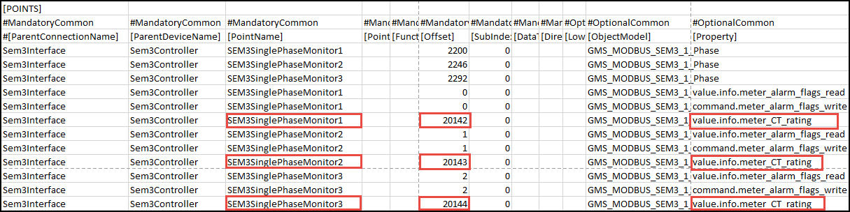 - If you want to configure the offset for the CT rating for each of the EMMM, then you need to mention the internal address for each EMMM as the Offset value for the value.info.meter_CT_rating property for each EMMM in the CSV file. For example, if you want to configure the CT rating for 3 EMMMs (Single-Phase Monitor 1, SEM3 Single-Phase Monitor 2, and SEM3 Single-Phase Monitor 3), then you will have to mention the internal address of the EMMM from the device manual (20142, 20143, 2144) as offset values for the value.info.meter_CT_rating property in the CSV file.