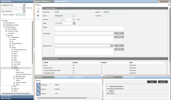 If the folder Modbus library is missing, and not available under Global Libraries in System Browser, you cannot work with Modbus. If the Modbus library is available, however, the version is not correct according to the latest technical information, you must contact the system librarian.