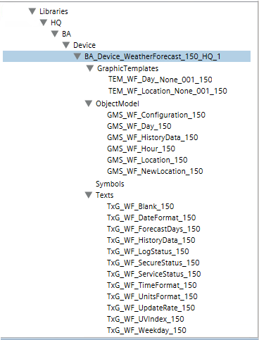The Weather Forecast extension installs the Desigo CC library BA_Device_WeatherForecast_150_HQ_1, which is available at Project > System Settings > Libraries > L1-Headquarter > BA > Device.