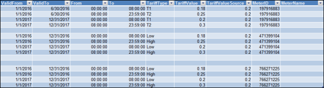 MeterName | Name of the managed meter to which this tariff is applicable. | You can view the names of the managed meters in your system on EnergyReportsExternalSetting.xlsx. |