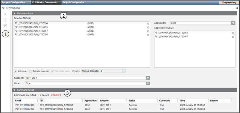 The APOGEE FLN Device Commander allows you to issue a single command to be applied to a selected group of points in the building system. You can command a set of BACnet FLN devices or TEC subpoints to specific values in one single operation. The devices can also reside in different networks and systems.