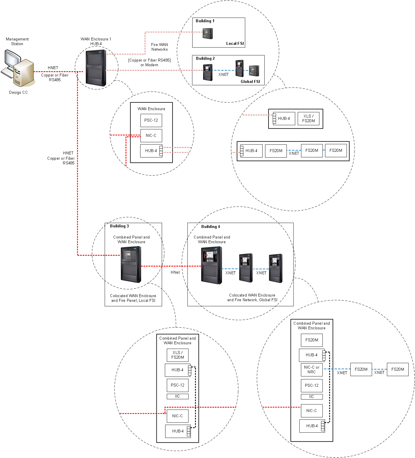 - Combined WAN Enclosure and fire control panel with an XNET (Building 4).