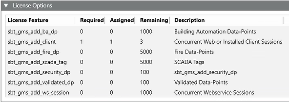 For license features covering field data points, the Required column indicates how many are physically connected to the Desigo CC server: the Assigned column must match this value (for Desigo CC to run in Normal Mode); and the Remaining column shows how many further points you can connect.