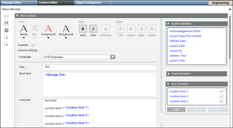 - Drag and Drop the Location Level 3 user variable in the message template as required and save the template. The following image displays the message template.