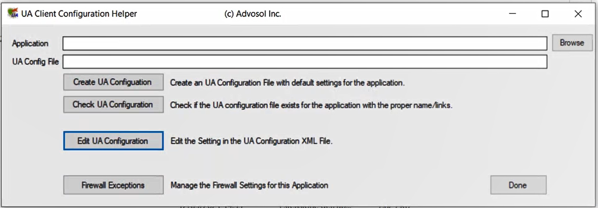 - To select the application, In the UA Client Configuration Helper dialog box, click Browse.