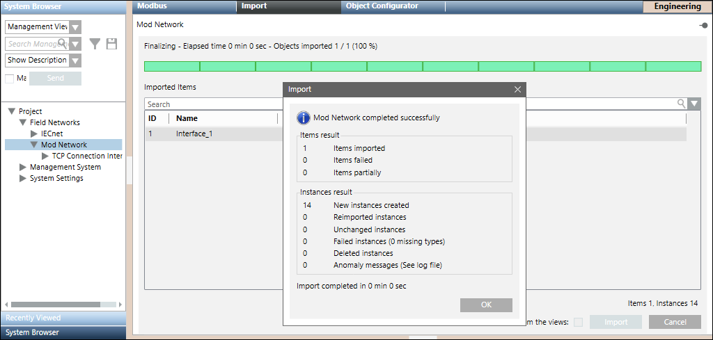 - When the import completes successfully, the Import dialog box displays a summary of the import information.