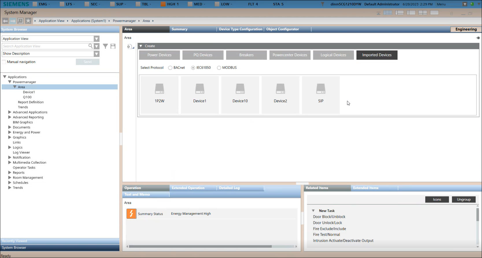 - In System Browser, select Application View > Powermanager > Area > Create Device