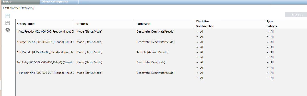 - Drag the following pseudo points to the macro instruction row: AutoPseudo, PurgePseudo, OffPseudo, Fan Spinning and Security (optionally twice).