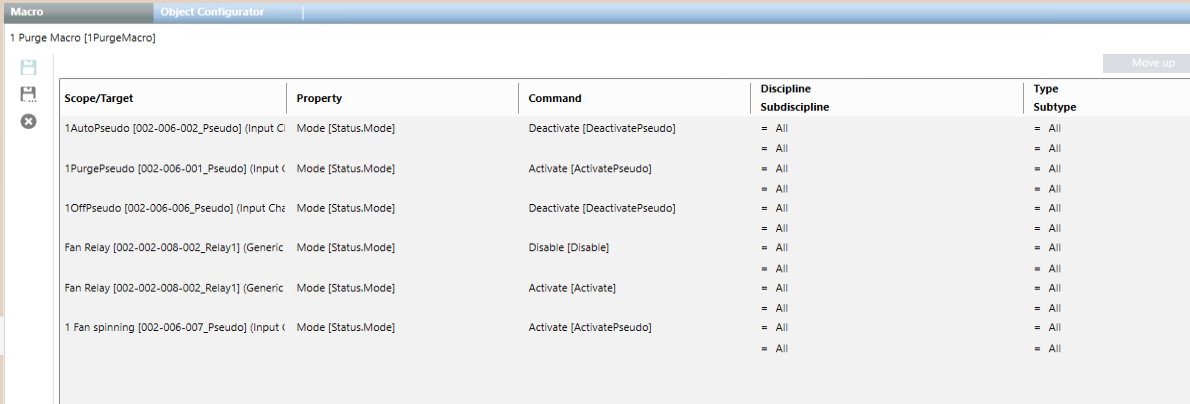 - Drag the following pseudo points to the macro instruction row: AutoPseudo, PurgePseudo, OffPseudo, Security (optionally twice) and Fan Spinning.