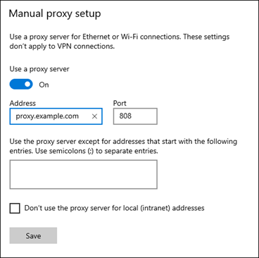 - If your proxy server is https://proxy.example.com/, enter proxy.example.com in the Address field.