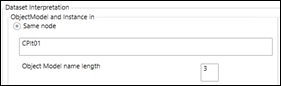 Select the Same node option, if you want to the object model and device instance to have the same name. Drag-and-drop the dataset node from the System Browser to the Same node field. Specify the length of the object model in Object Model name length. The name of object model will be set according to the number of characters specified. The device instance will be created with the complete node name. For example, if the name of the dropped node is CPlt01 and the specified length is 3, then the object model name will be CPl and the name of the device instance will be CPlt01.